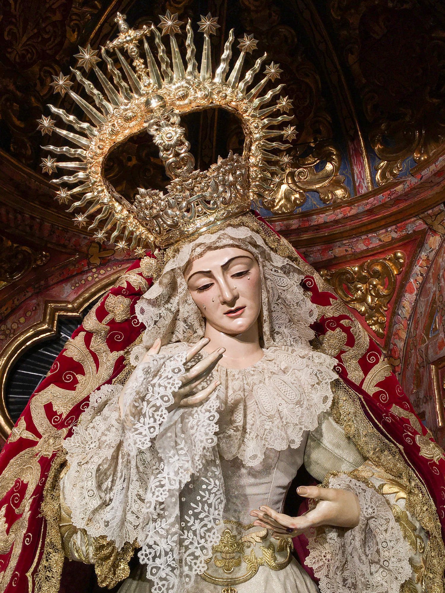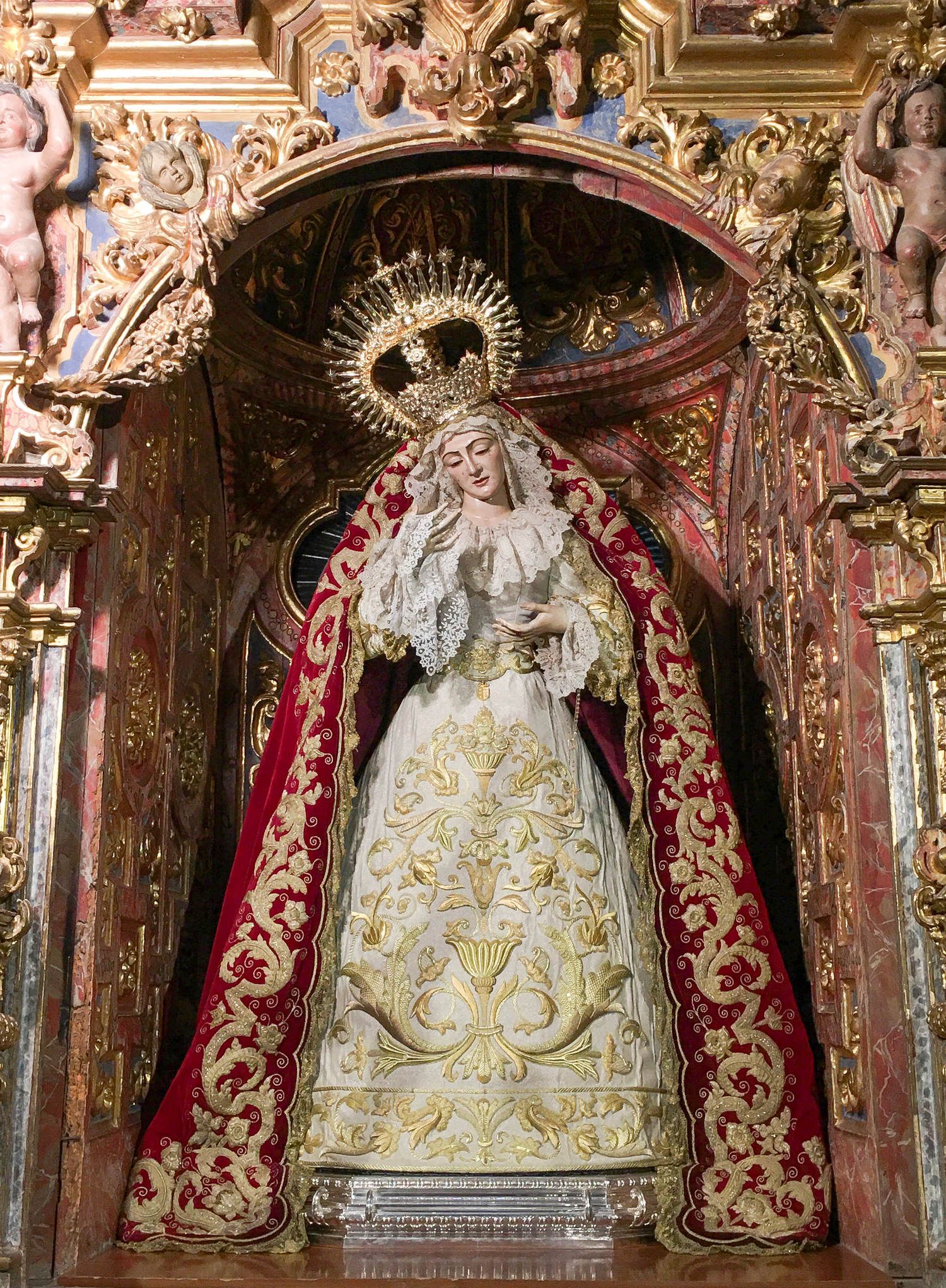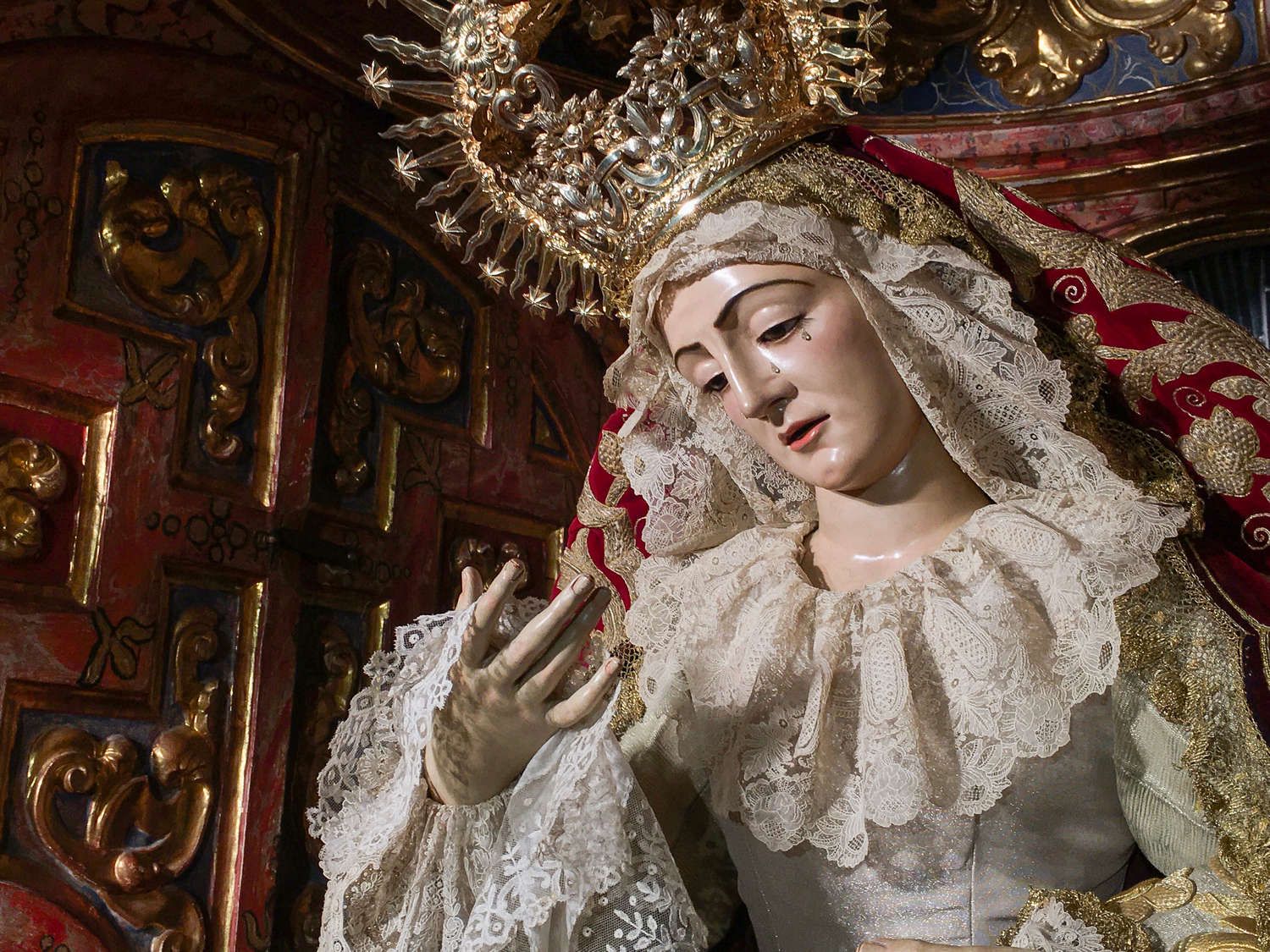 La Virgen de los Dolores ataviada para la Festividad del Corpus Christi 2020.